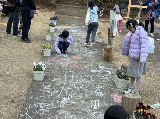 暖かいインカの秘宝の薬草を飲み、チョコ・飴などを頂きながら、社務所での塗り絵や参道でのお絵描きなどで楽しい時間を過ごしました。