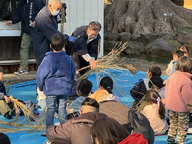 豆まきが終わると、今度はしめ縄作りです。最初はなかなか上手くいきませんが、子之社総代からの優しい指導を受けながら、みんな頑張って作りました。少し不格好でもみんな満足です。親子で楽しい体験ができました。