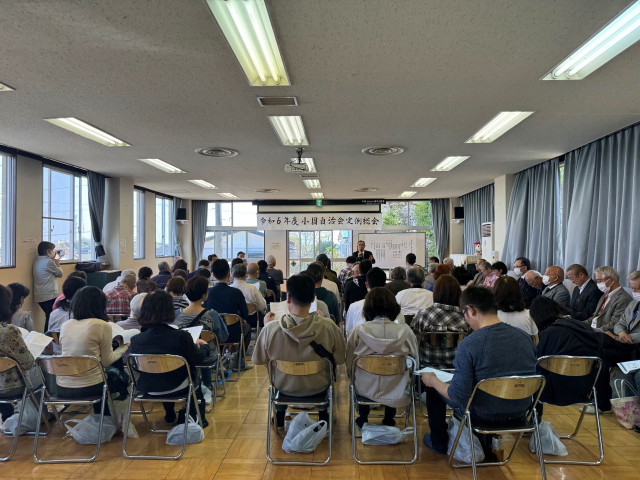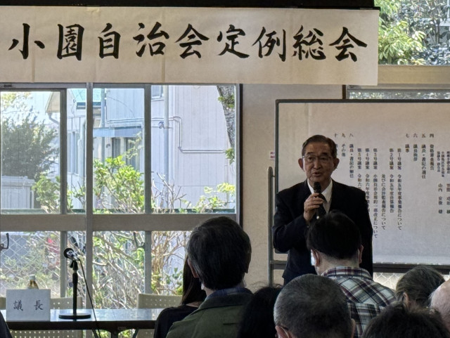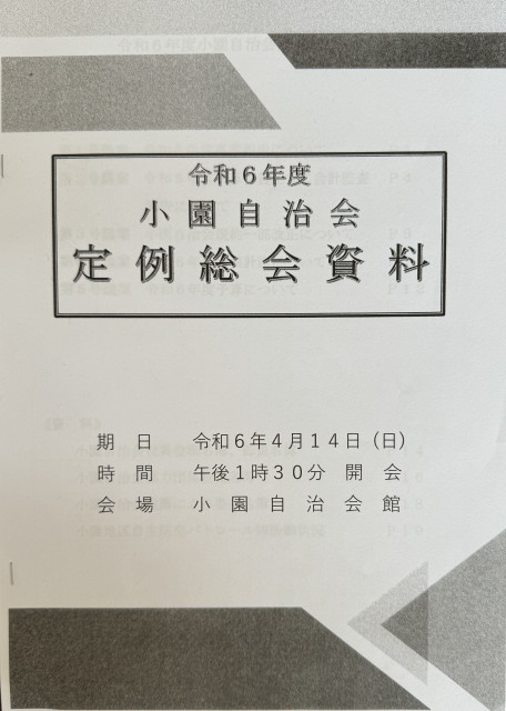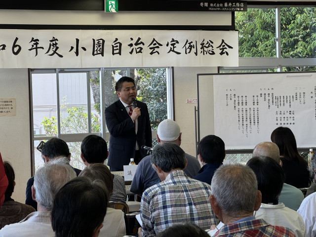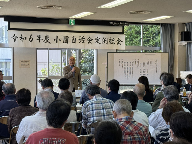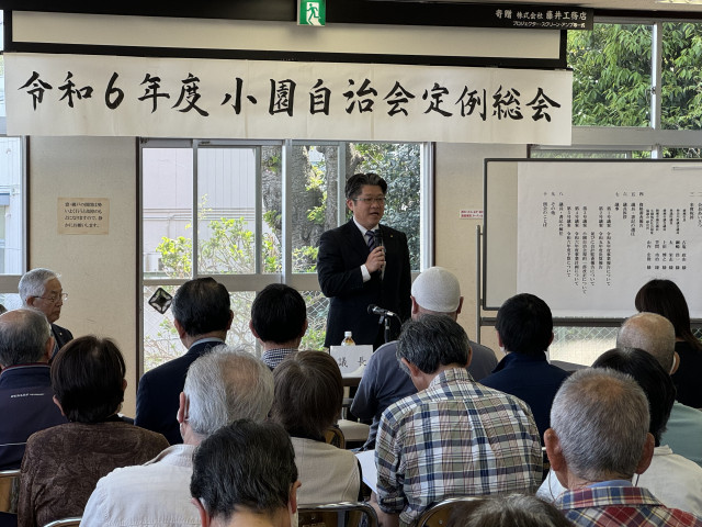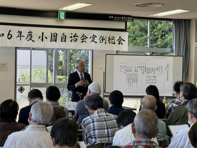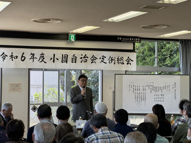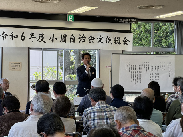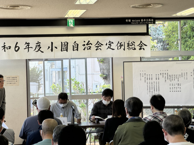春の日差しのなか、4月14日(日)小園自治会館で令和6年度小園自治会定例総会が開催されました。新型コロナウイルスが5類感染症に移行された事を受けて、5年ぶりに来賓を迎えての平常開催となりました。