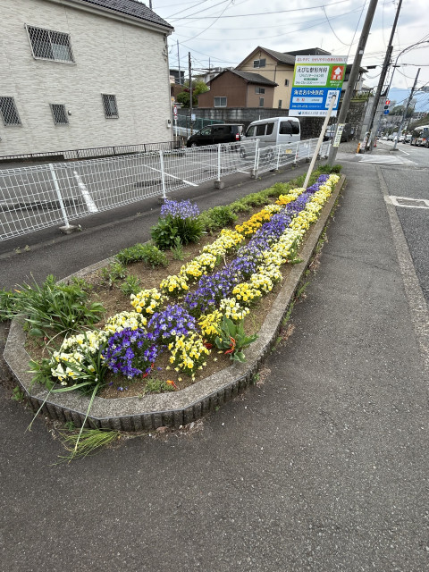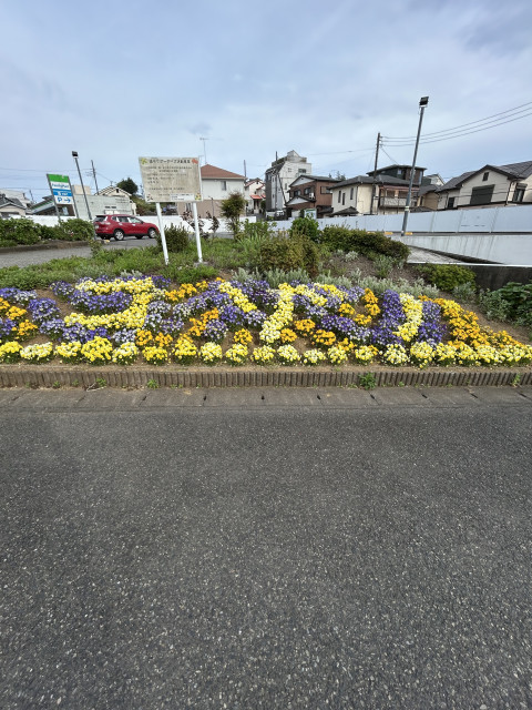 望地の交差点とファミリーマートの間です。素敵だなぁと思い調べてみたところ、これは「すみれグループ」の方々が日々花壇整備をおこなって頂いていることだとわかりました。「すみれグループ」は4区在住の矢部さん、2区在住の小迫さんを中心に活動されているとのことです。活動内容はファミリーマート付近の花壇の整備を主にしており、今年で26年目になるそうです。