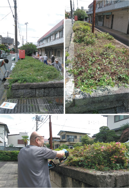 また、雑草が伸びきった植え込みでは、床屋さんが、商売道具のバリカン(草刈仕様です)を持ってきて、ブイ~~ンと草木を短くカットしていました。あっという間に草刈作業が終わって、集まった人たちから「ありがとう助かったわ」の声が上がっていました。