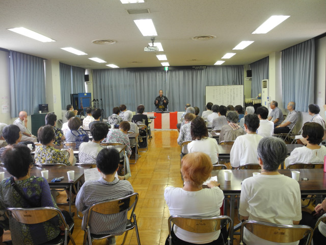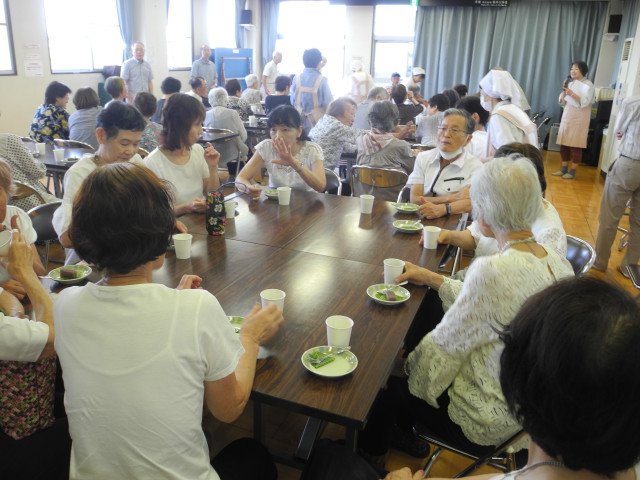 食生活改善推進協議会の方々が前日から準備してくれた、冷え冷えの水ようかんに舌鼓をうちながら、参加された方々からは「落語あり、歌あり、冷えたスイーツあり、和気あいあいの雰囲気が最高でした。大きな声で歌うことができ晴れ晴れとした気分になった。水ようかんが美味しくってお替わりしたかった。お隣さんとお友達になれました。今日は楽しかった。」などのおしゃべりが聞こえてきました。