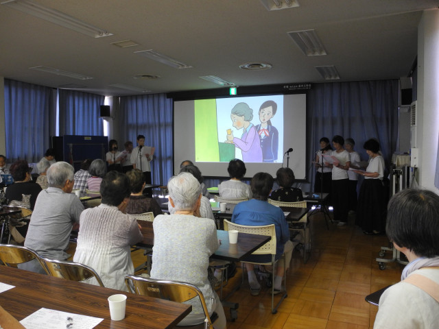 朗読劇の次は、「生なまず、生なまこ、生なめこ」「交響曲、歌曲、協奏曲」などの早口言葉です。大きな声で挑戦しておりましたが声を出すたびに滑舌が良くなって来たようでボケ防止にもつながったようです。締めは「知床旅情、バラが咲いた、高校三年生」をみんなで合唱して、和やかな雰囲気を醸し出してくれました。