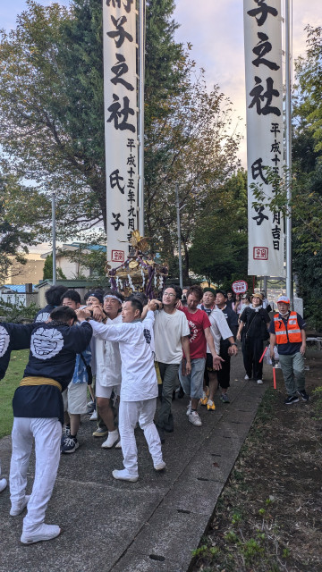 二日目最後の3区は、青空を背に、小園台第一公園をスタートして区内を回りました。お囃子の音や子ども達の掛け声とともに、長い一日を回り切った神輿は、最後の宮入に向けて神輿會の男衆にバトンタッチされました。