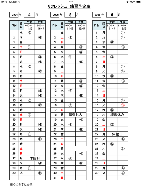 練習予定表(2026年4月〜6月)