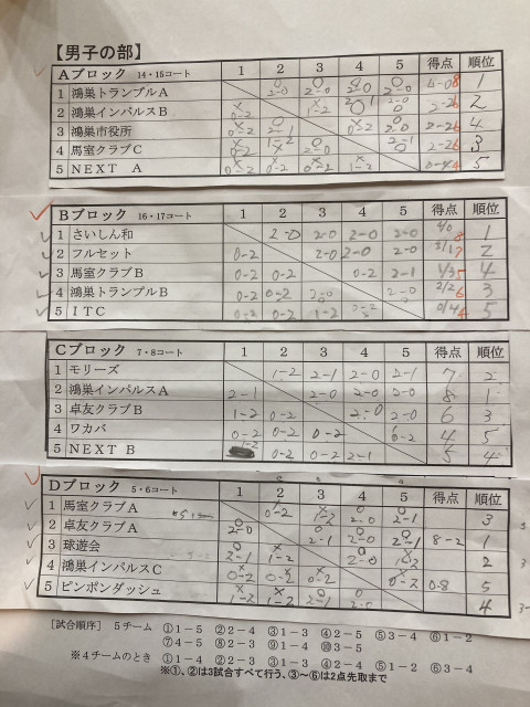 【試合結果】コスモス卓球大会 (ダブルス団体戦)男子