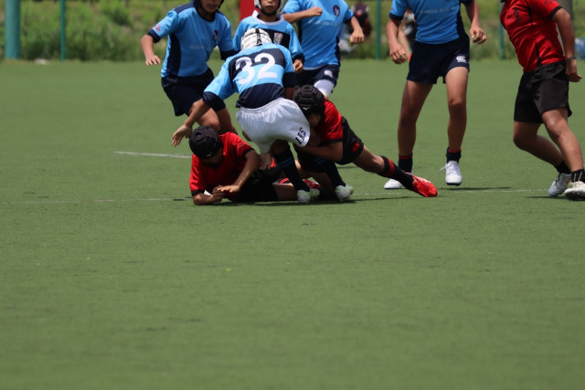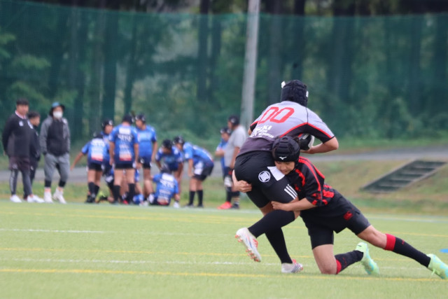 仲間のために身体を張って相手との距離を詰めてタックルに入る。
