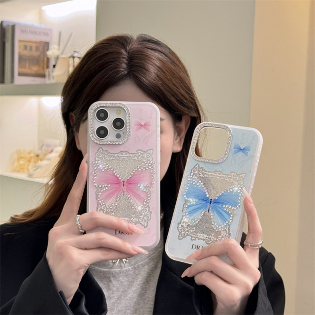 バタフライ柄をあしらったディオール風のIPhoneケース。バタフライモチーフとカメラの周りはラインストーンで飾られて、持つだけで女子力アップ!ディオールのブランドロゴもあしらい、お洒落で高級感を引き出します。可愛いブルーとピンクの2色があり、親友とのお揃いアイテムにもおすすめです♡