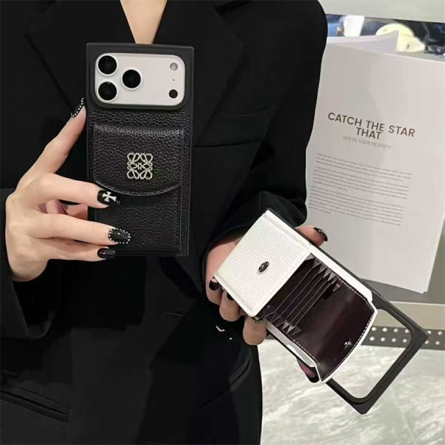 ロエベ風スクエア型のiPhone17/16ケースです。ブランドのアナグラム金具をあしらい、上品でスタイリッシュなデザインに仕上げました。背面にアコーディオン式カードポケットを搭載しており、カードや名刺などを複数収納可能。白と黒の2色展開で、カップル用にも最適!