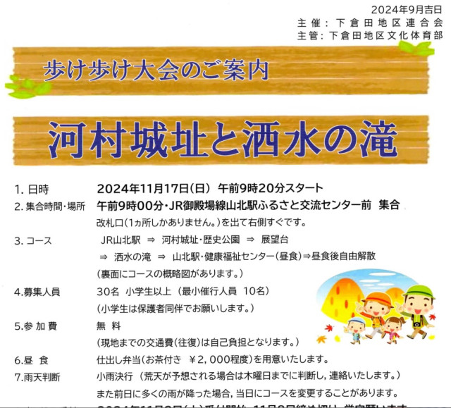 202410-01 【歩け歩け大会のご案内】河村城址と洒水の滝(主催:下倉田地区文化体育部)--- 実施日:11月17日(日)