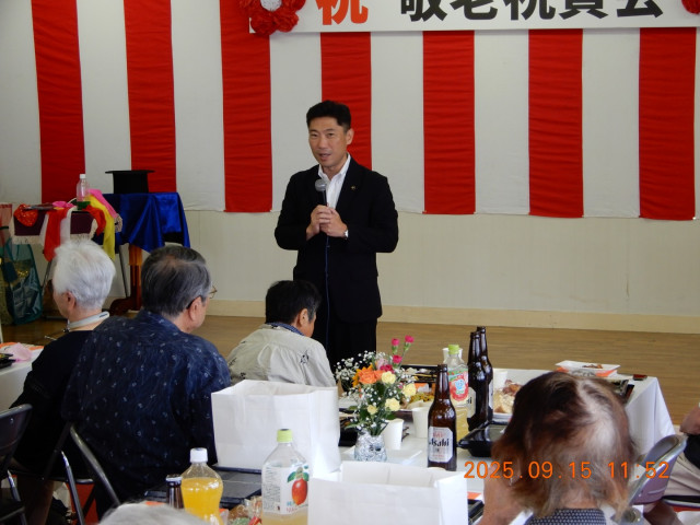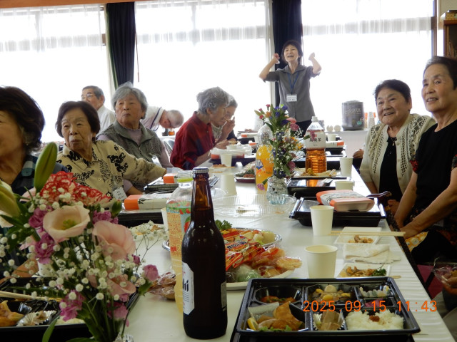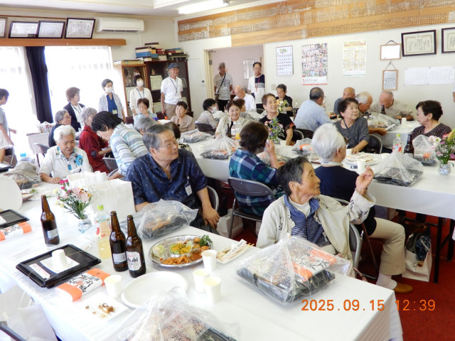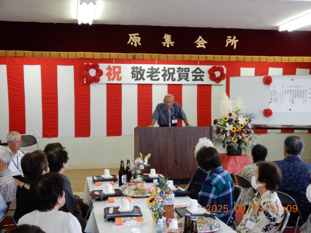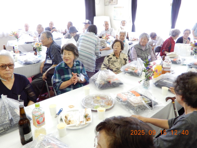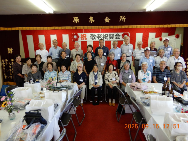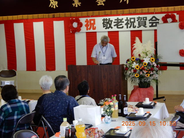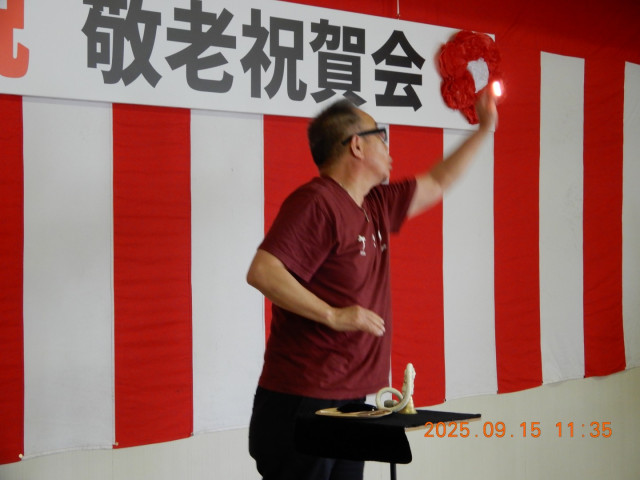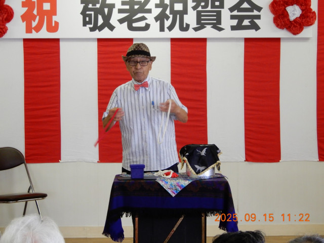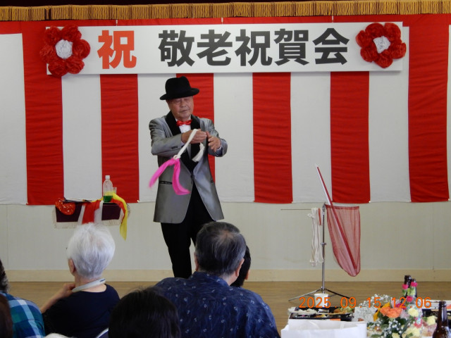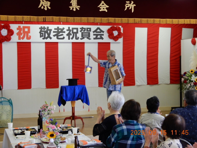 9月15日(月)敬老の日に高野原集会所で敬老祝賀会が開催され、35名の方が参加されました。高野原集会所での開催は、初めてのことで飲食やマジックショーにお楽しみ抽選会と楽しい時間を過ごして頂きました。