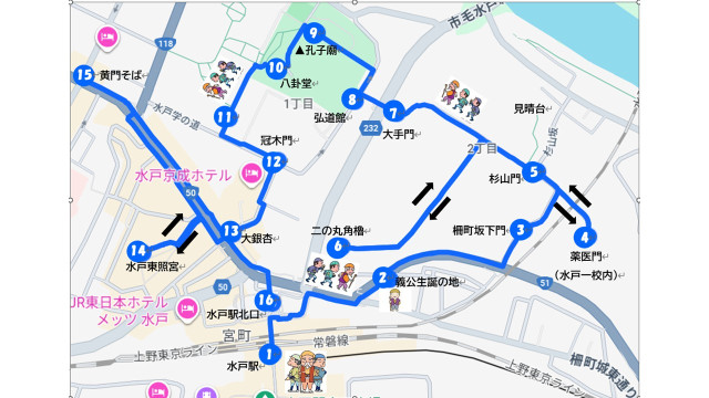 8:45佐和駅に集合(参加者確認)~9:03佐和駅出発→9:14水戸駅北口助さん格さん像前(準備体操)⇒義公生誕の地⇒柵町坂下門⇒薬医門⇒杉山門⇒二の丸角櫓⇒大手門⇒弘道館⇒孔子廟⇒八卦堂⇒大銀杏⇒水戸東照宮⇒昼食(黄門そば)⇒水戸駅(整理体操→解散13時頃)