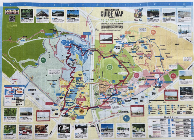西口・翼ゲートからスタート⇒そよかぜ橋⇒草原エリア⇒はまかぜ橋⇒みはらしの丘⇒古民家⇒昼食(自由時間60分)⇒西口・翼のゲートを出る≪下図のGUIDE MAPに徒歩ルートをピンク線で示す≫