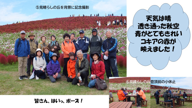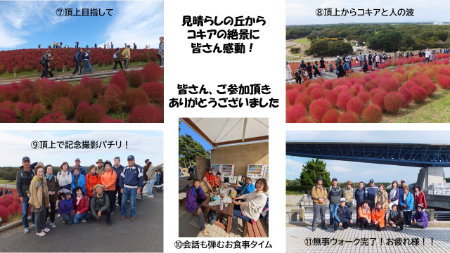 「コキア、コスモス、蕎麦の花、そして太平洋のコントラストが素晴らしい!」 「綺麗!」「参加して良かった!」と感動の声が次々と。役員一同も心の中で感激し、参加者の皆さんに改めて感謝の気持ちを抱きました。 予想通り、海風が強く、帽子を飛ばされる見学者も多数。ウォーキング仲間の何人かも帽子を追いかけてコキアの中を走る姿が…。これも良き思い出ですね。 次回は防風対策もお忘れなく!