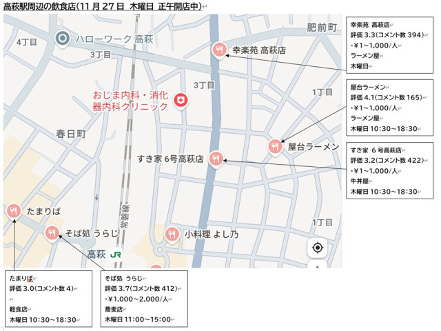 昼食:幸楽苑(ラーメン)、そば処うらじ、たまりば 等あります。