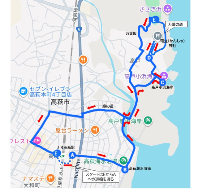 高戸の小浜海岸⇒(かんしゃ神社)⇒万葉の道⇒万葉坂⇒高戸の小浜⇒