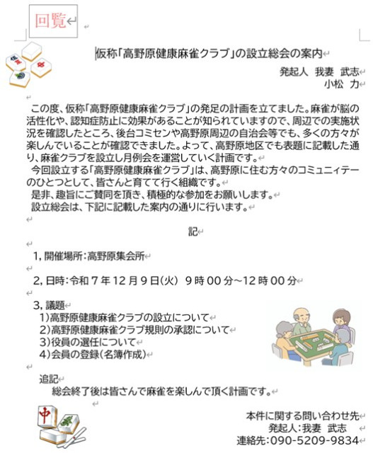 「仮称『高野原健康麻雀クラブ』設立総会のお知らせ」