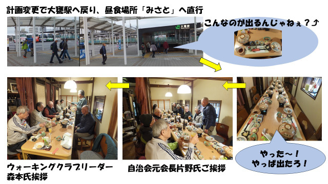 パークに長居したため急遽計画変更!後半のウォークを断念し泉神社はスキップ。大みか駅へ戻り、昼食会場の「みさと」へ直行。でも、女性陣は昼食後泉神社ウォークを敢行、動画を送ってくれたことに感謝とともに女性陣の行動力に脱帽です!男性陣も負けていられませんね。