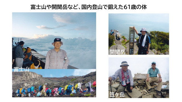 高校時代の登山部仲間に誘われ、男女10名の仲間とともにアタックを決定。還暦のお祝いの席でご家族に宣言し、雪の少ない時期を選び、61歳の正月に決行としました。事前に富士山など国内の山で体を鍛え、準備を重ねたそうです。