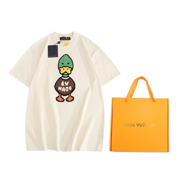 ホワイト(ベージュ調)のニット地に、“LV MADE” を着たカモメ風ダック がジャカードされた T シャツ。コミカルなデザインながら、ルイ・ヴィトンのロゴがしっかりと入り込むことで “可愛さ × 高級感” のバランスを完璧にコントロール。