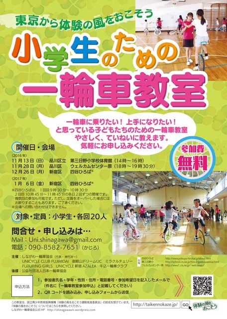東京から体験の風をおこそう、一輪車教室が開催されます 一輪車にのってみたい、やってみたい方 参加してくださいね。