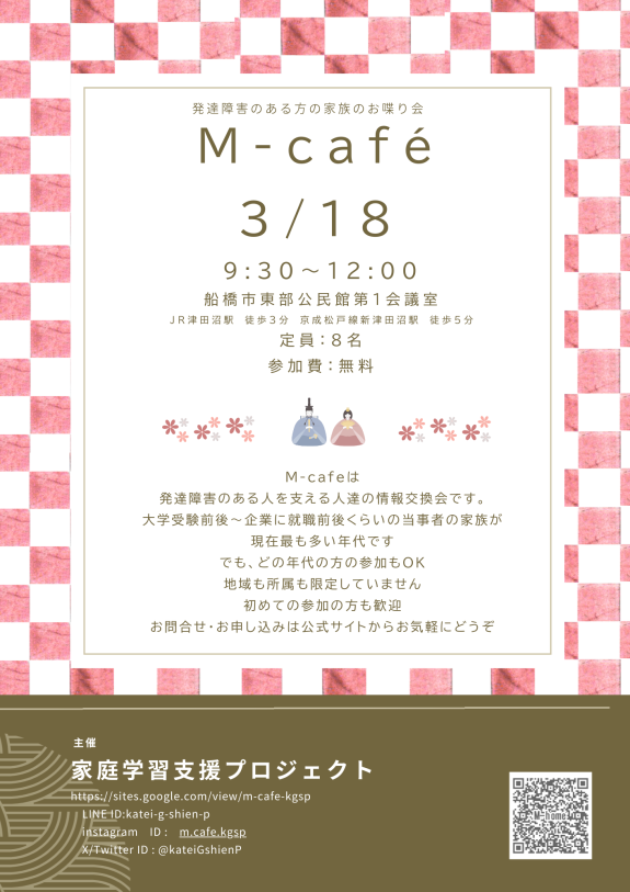 3月M-cafeは船橋市東部公民館で午前中開催です。