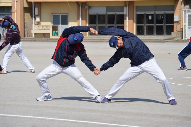 親父たちには少々キツメのアップ・ストレッチ・ベーランなどでグラウンド中を走り回り、たっぷりと汗を流しました{emoji index="22"}