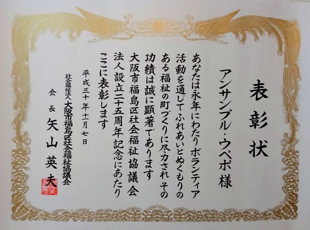 福島区社会福祉協議会法人設立25周年記念 福島区社会福祉大会にて、永年にわたりボランティア活動を通して、ふれあいとぬくもりのある福祉の町づくりに尽力したとして表彰状をいただきました。