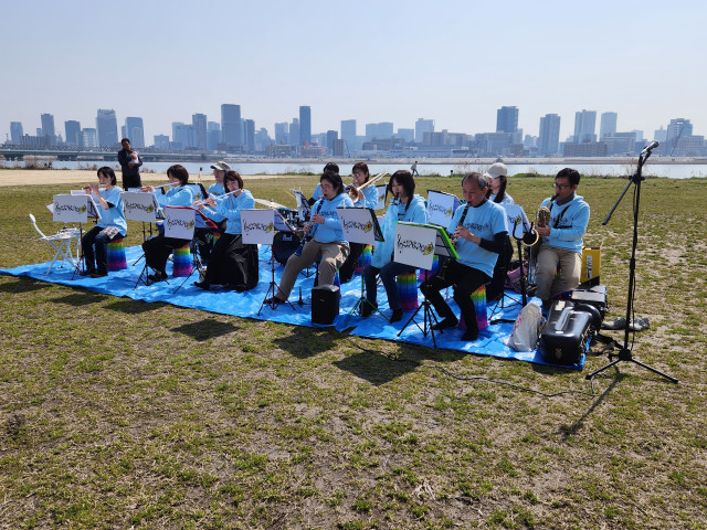 今年も「淀川河川敷クリーン大作戦」とコラボさせていただいて、ゴール地点辺りで、演奏しました。