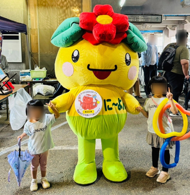 出演までの間、団員たちも他のグループの皆さんのブースに立ち寄ったり、西淀川区のキャラクター「に~よん」と記念撮影も😆
