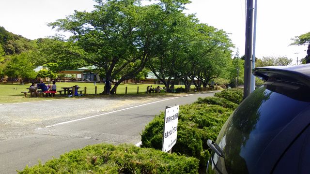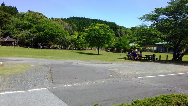あずまや、奥のバーベキュー施設にお年寄りや大学生?が20人前後