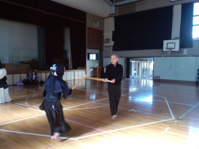 基本組で頑張っていた勇太君、優大君、咲希ちゃんが防具をつけての基本稽古を始めました。杉山先生と切返しを行なっている後姿です。