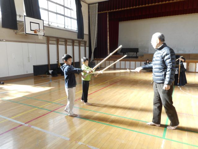 こちらは、基本組の小学生が「構え方」を杉山先生から教わっています。