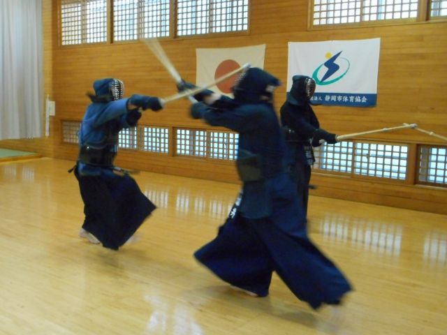 一般の部では、回り稽古式で、自分がやりたい基本稽古をお互いに行います。それから2分で区切った地稽古になり、一回りしたところで休憩します。「今日は、雨が降ってきた為かとても蒸しました。」