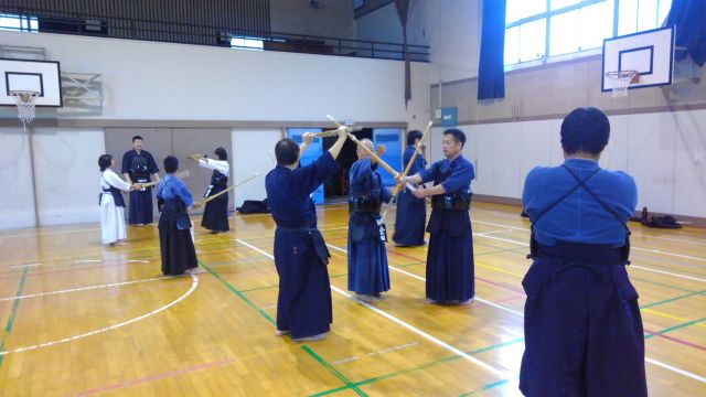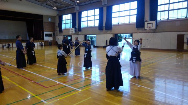 防具組の小学生、中学生と共に大人の方も基本稽古をしています。