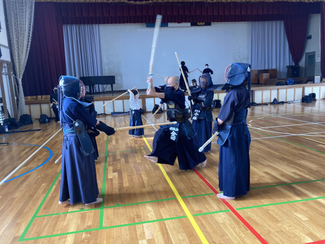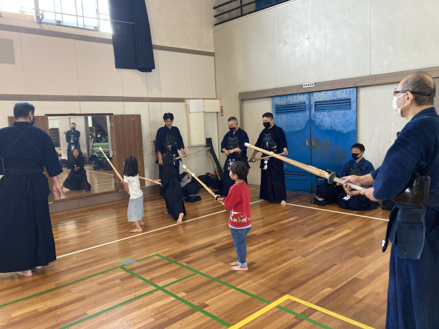 防具を付けたての初心者に対しては、主任先生である金田先生が自ら面打ちの見本を披露して分かりやすい指導をしています。