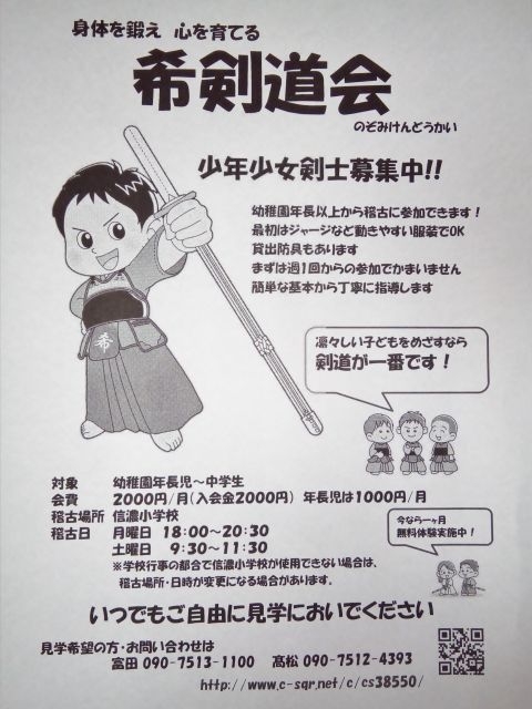 希剣道会では、幼稚園年長から中学生の少年少女剣士を募集しております{emoji index="140"}