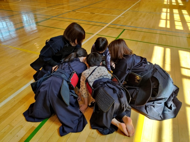 後輩剣士達は、スコアのつけ方を先生に聞いています。