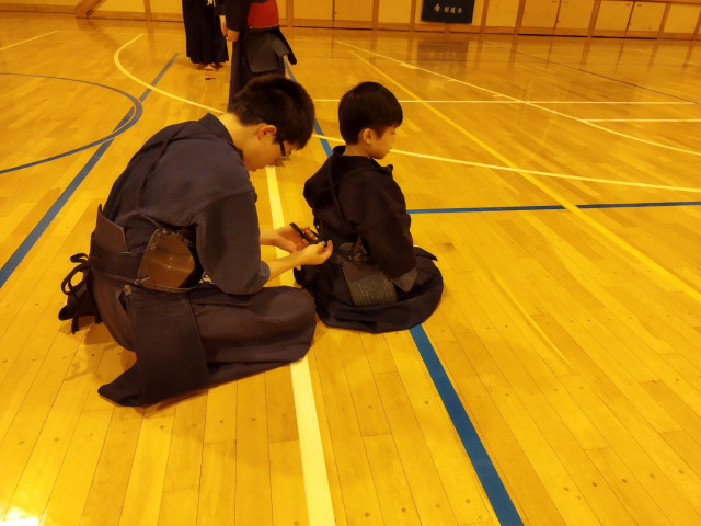 先輩剣士が見守り、着け終わった後に点検をしています。