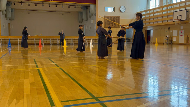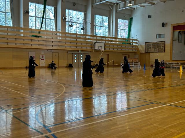 体育館の暖房が途中でとまってしまい寒い体育館での稽古でしたが、剣士たちは息を切らしながら顔を赤くして稽古に励んでいました。
