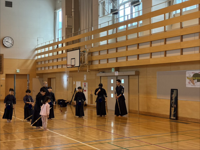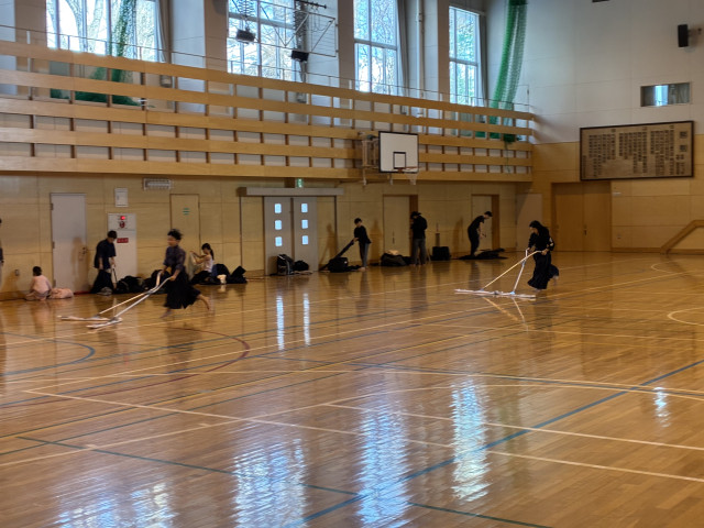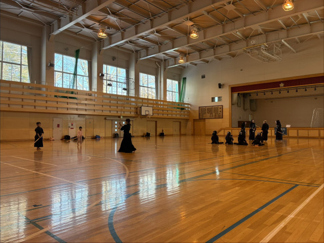 朝の体育館は暖房がついたばかりなのでとても寒く、床も冷たいです。そんな中剣士たちは頑張っています。