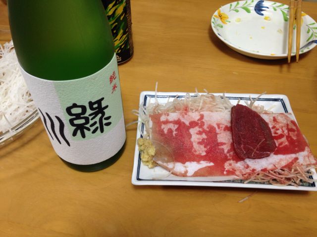 私は、馬刺しをツマミに、村田コーチに教えてもらった、数ある日本酒から新潟の緑川の純米酒をセレクトし、一杯やります。