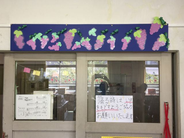 まずは、図書室入り口の装飾を秋の味覚「ぶどう」に。おいしそうです^ ^