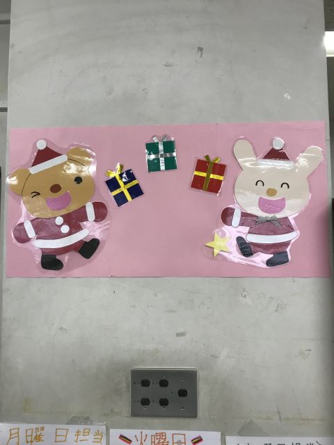 入り口横でも、にこにこサンタさん達がプレゼント運び。