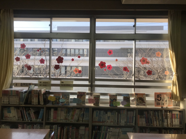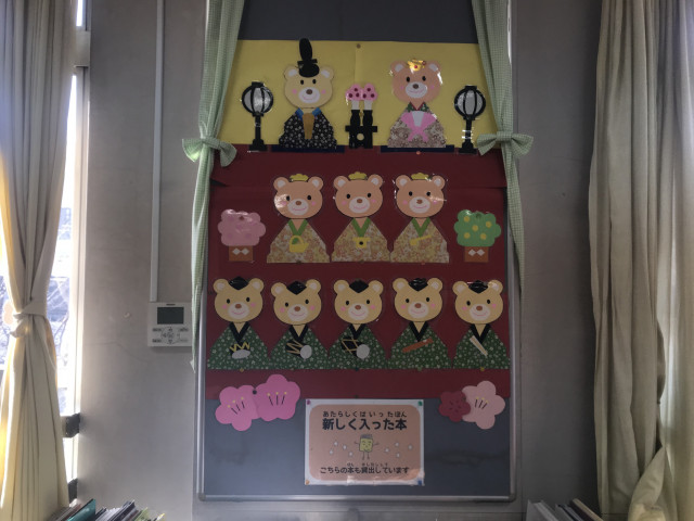 図書室にも そんな季節の変わりを感じてほしくて、おひな様の装飾を行いました。