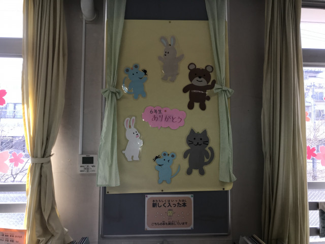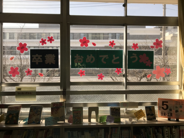 3/4 今年は趣向をかえて?図書室内に「卒業おめでとう」の装飾を行いました。
