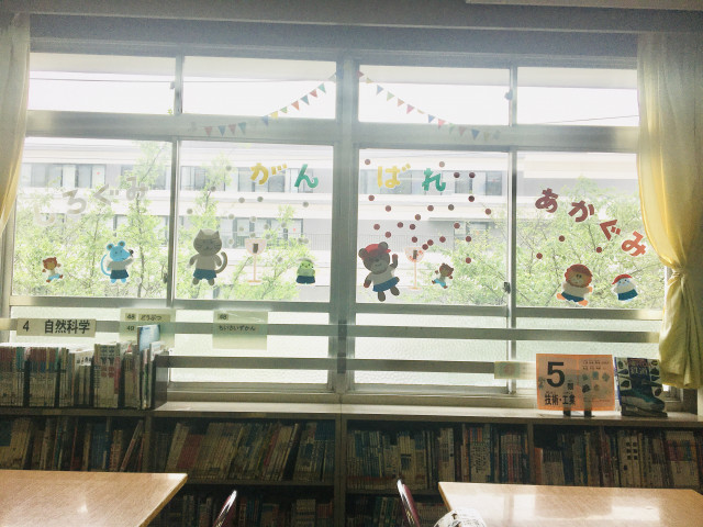 6月にスポーツフェスティバルか開催されるため、図書室の窓に運動会の装飾を。