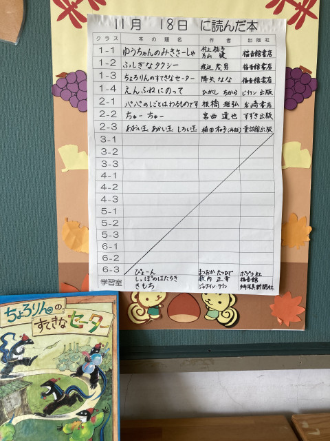 本日は1.2年生と学習室の読み聞かせがありました。1年生では、新規メンバーのボランティアさんが初めて参加しましたが、問題なく楽しく読み聞かせ活動ができたようで良かったです。
