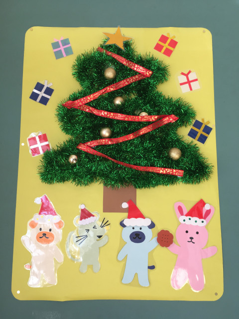 サンタさんに扮した動物さんたちや、キラキラのモールで作ったクリスマスツリー。