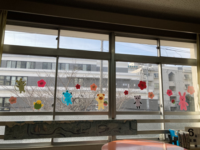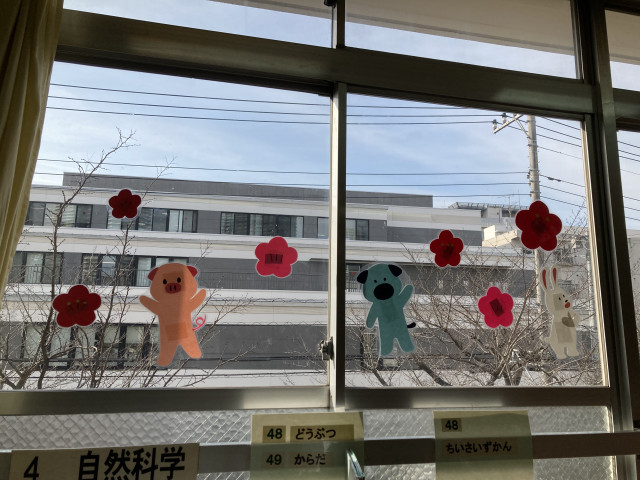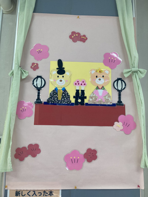 3月に入り、少しずつ暖かな日が増えてきました。図書室は桃の花を中心に、ひな祭りの装飾です。
